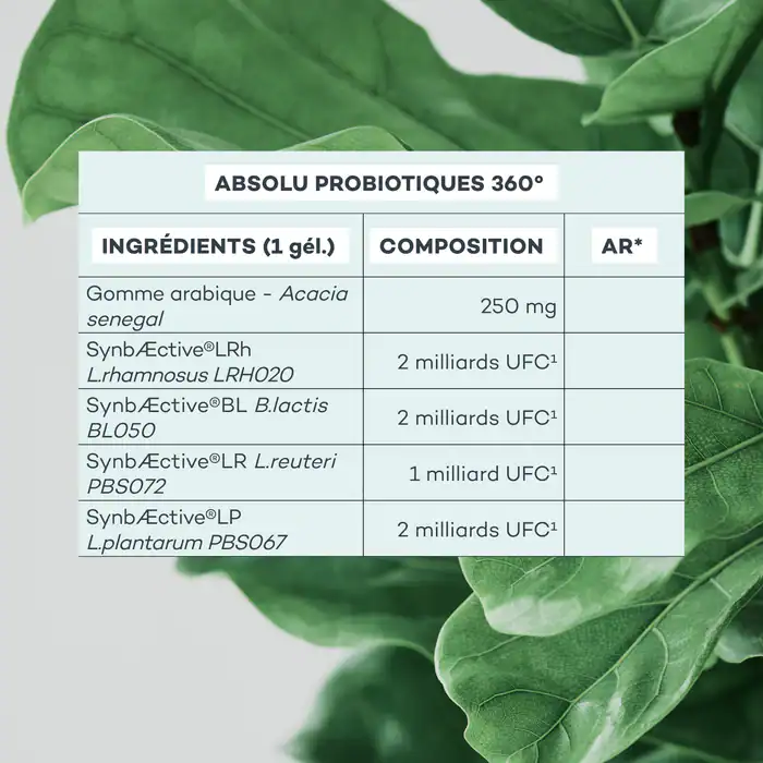 INGRÉDIENTS (1 gél.) • Gomme arabique – Acacia senegal 250 mg • Gélule végétale (agent d’enrobage : hydroxypropylméthylcellulose, gélifiant : gomme gellane) • Farine de banane verte – Musa paradisiaca 70 mg • Mix de 4 souches probiotiques (7 milliards UFC1) : SynbӔctive®LRh L.rhamnosus LRH020 (2 milliards UFC1), SynbӔctive®BL B.lactis BL050 (2 milliards UFC1), SynbӔctive®LR L.reuteri PBS072 (1 milliard UFC1), SynbӔctive®LP L.plantarum PBS067 (2 milliards UFC1).