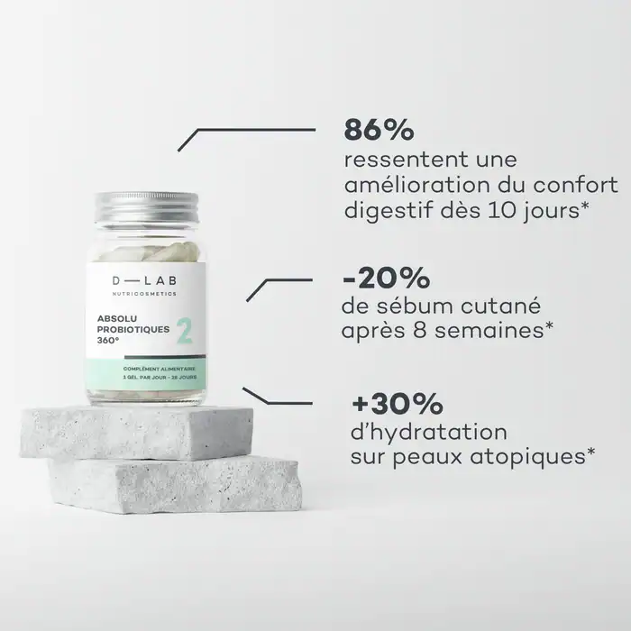L’Absolu Probiotiques 360° agit dès les premières prises pour rétablir un microbiote intestinal stable, capable de soutenir un transit régulier, de réduire les ballonnements et d’apaiser les douleurs abdominales.