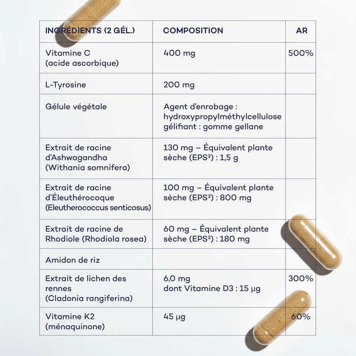 INGRÉDIENTS (2 gél.) • Vitamine C (acide ascorbique) 400 mg 500% AR1 • L-tyrosine 210 mg • Gélule végétale (agent d’enrobage : hydroxypropylméthylcellulose, gélifiant : gomme gellane) • Extrait de racine d’ashwagandha (Withania Somnifera) 130 mg – EPS² 1,5 g • Extrait de racine d’éleuthérocoque (Eleutherococcus senticosus) 100 mg – EPS² 800 mg • Extrait de racine de rhodiole (Rhodiola rosea) 60 mg – EPS² 180 mg • Amidon de riz • Extrait de lichen des rennes (Cladonia rangiferina) 6,0 mg dont Vitamine D3 15 µg 300% AR1 • Vitamine K2 (ménaquinone) 45 µg 60% AR1.