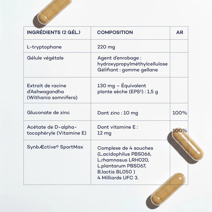 INGRÉDIENTS (2 gél.) • L-tryptophane 220 mg • Gélule végétale (agent d’enrobage : hydroxypropylméthylcellulose, gélifiant : gomme gellane) • Extrait de racine d’ashwagandha (Withania somnifera) 130 mg – EPS1 1,5 g • Gluconate de zinc dont zinc 10 mg 100% AR² • Acétate de d-alpha-tocophéryle dont vitamine E 12 mg 100% AR² • SynbÆctive® SportMax : Complexe de 4 souches (L.acidophilus PBS066, L.rhamnosus LRH020, L.plantarum PBS067, B.lactis BL050 ) 4 Milliards UFC 3.