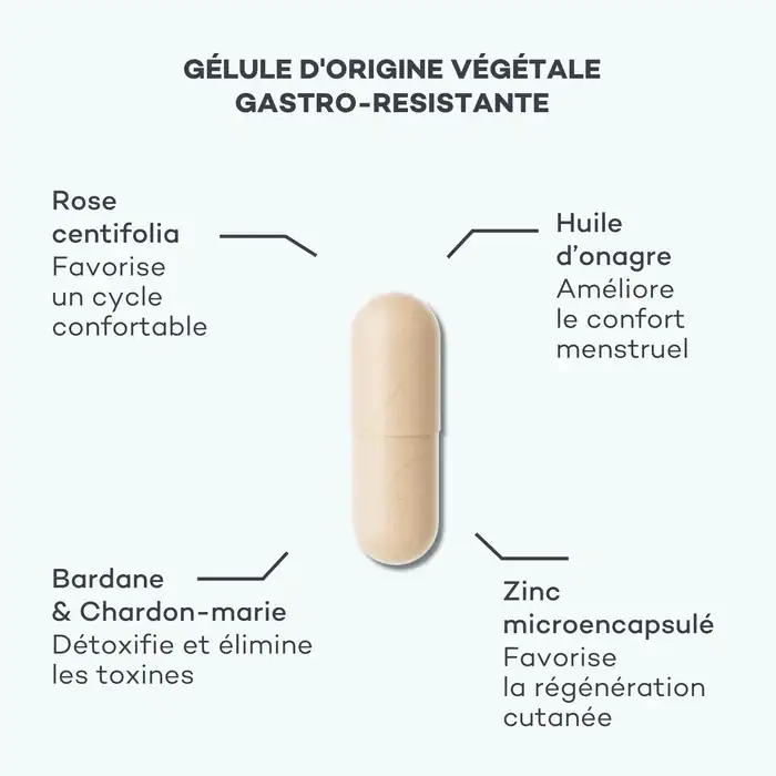 ¹ La bardane favorise la purification du sang et aide à maintenir une peau en bonne santé. – Le lodhra soutient la santé du foie, supporte la santé des organes reproducteurs féminins et améliore le teint. – Le chardon-marie soutient la santé du foie et aide à protéger le foie ce qui maintient la fonction du foie et en outre stimule la digestion et la purification de l’organisme. – La rose centifolia aide à maintenir un cycle menstruel confortable. – La vitamine B6 contribue à réguler l’activité hormonale et réduire la fatigue. – Le zinc contribue au maintien d’un taux normal de testostérone dans le sang. – Le magnésium contribue à des fonctions psychologiques normales.