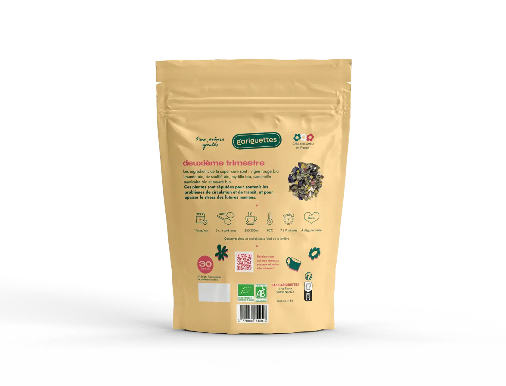 Notre tisane pour le deuxième trimestre de grossesse est conçue pour accompagner et soulager les femmes enceintes.