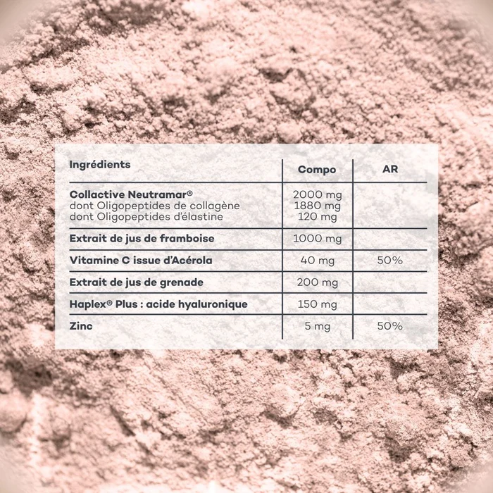 INGRÉDIENTS (1 c.à.s. soit 6 g) • Oligopeptides de collagène 1,88 g et oligopeptides d’élastine 120 mg (poisson, mollusque, crustacé), arôme naturel, glycosides de stéviol • Fructo-oligosaccharides • Poudre de jus de fruit de framboise – Rubus idaeus 1 g • Arôme naturel goût framboise • Poudre de fruit d’acérola – Malpighia glabra 235,3 mg titré en vitamine C 40 mg 50% AR1 • Poudre de jus de fruit de grenade – Punica granatum 200 mg • Acide hyaluronique 150 mg • Gluconate de zinc dont zinc 5,0 mg 50% AR1 • Denrée alimentaire colorante (concentré de betterave rouge, carotte).