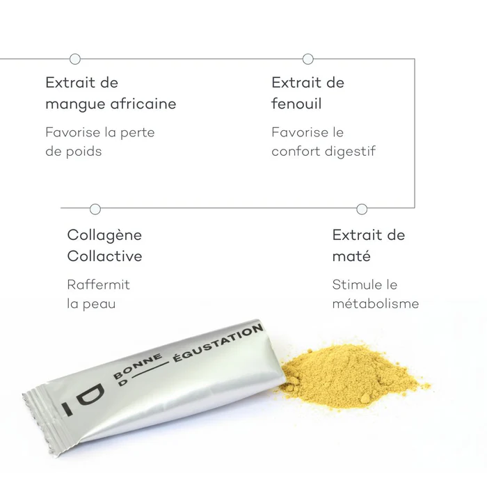 INGRÉDIENTS (1 c.à.s. ou 1 stick soit 6,0 g) • Collagène Collactive® : oligopeptides de collagène (1,88 g) et oligopeptides d’élastine (122 mg) hydrolysés d’origine marine (poisson, mollusque, crustacé), Neutramar® : arôme naturel, glycosides de stéviol • Fibre d’acacia – Acacia Senegal • Fructo-oligosaccharides • Extrait de feuille de maté – Ilex paraguariensis 800 mg (EPS1 : 3,2 g) titré en caféine 40 mg • Poudre de fruit d’acérola – Malpighia glabra 541,18 mg titré en vitamine C 80 mg 100% AR2 • Arôme naturel de mangue • Extrait de noyau de mangue africaine – Mangifera indica 300 mg (EPS1 3,0 g) • Extrait de fenouil – Foeniculum vulgare 200 mg (EPS1 : 800 mg) • Denrée alimentaire colorante • Vitamine B6 1,40 mg 100% AR2 • Chlorure de chrome dont chrome 40 µg 100% AR2.
