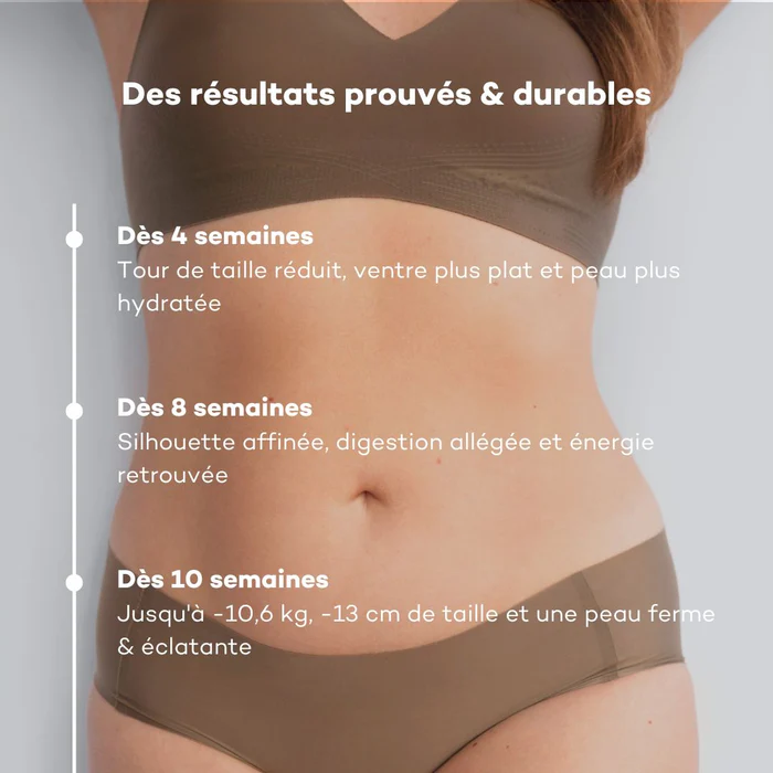 Résultat : ventre plat, silhouette affinée et peau tonique (jusqu’à -10,7 kg et -13 cm de tour de taille en 10 semaines)